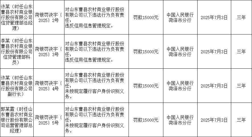 时任该行信贷管理部总经理许某、时任该行信贷管理部科员李某二人对违反信用信息管理规定负有责任,时任该行副行长许某、时任该行运营管理部总经理郭某霞二人对未按规定履行客户身份识别义务负有责任。上述人员均被罚款1.5万元。