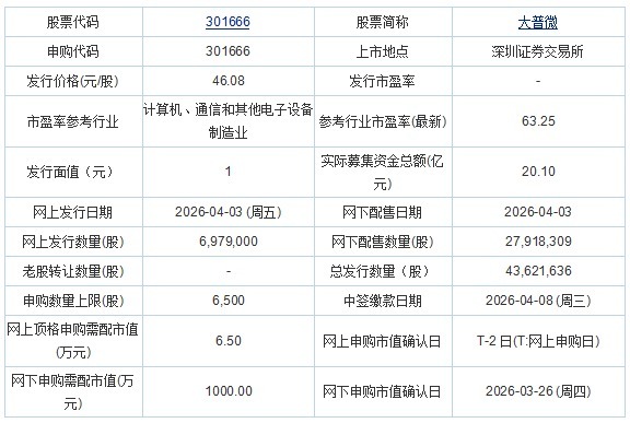 大普微2026年4月2日披露的首次公开发行股票并在创业板上市发行公告显示,按本次发行价格46.08元/股计算,公司募集资金总额预计为201,008.50万元,扣除预计发行费用13,129.51万元(不含增值税)后,预计募集资金净额约为187.878.99万元。
