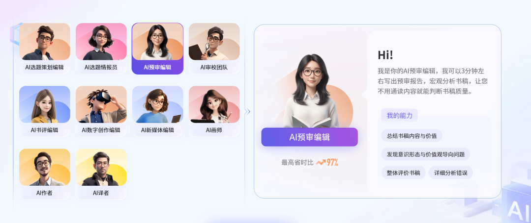 例如,AI选题情报员监测图书榜单和业内新动态,为编辑建立潜在选题库;AI选题策划编辑收集同类竞品图书信息,辅助市场分析。